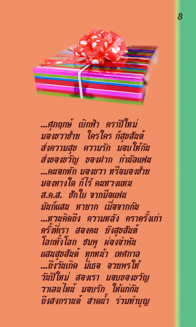 แต่ผมไม่สงวนสิทธิ์ สำหรับผู้อ่านที่ชื่นชอบ บทใดบทหนึ่งที่จะเก็บรักษาไว้เพื่อเป็นที่ระลึก โดยไม่มีผลประโยชน์ทางการค้า แต่ต้องไม่แอบอ้างว่าเป็นผลงาน ของตนเองโดยเด็ดขาด ***